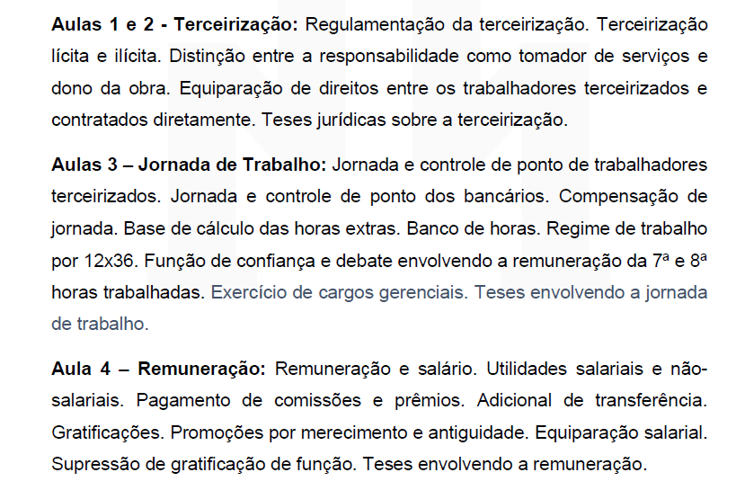 As aulas serão ministradas pelo juiz titular da Vara do Trabalho de Formosa (GO), Fabiano Coelho de Souza e pelo Juiz Titular da 6ª Vara do Trabalho de Brasília, Antonio Umberto de Souza Júnior. A cada encontro será fornecido um arquivo em PDF com informações relevantes sobre os temas abordados farta jurisprudência exemplificativa das situações descritas.