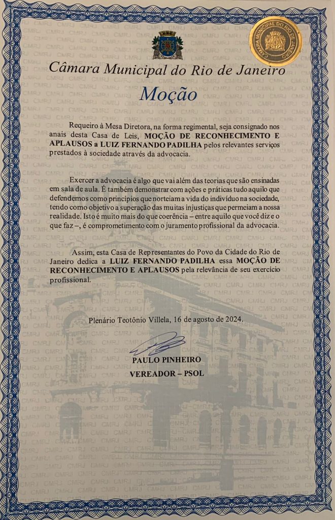 “Assim, esta Casa de Representantes do Povo da Cidade do Rio de Janeiro dedica a LUIZ FERNANDO PADILHA essa MOÇÃO DE RECONHECIMENTO E APLAUSOS pela relevância de seu exercício profissional.”