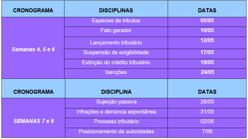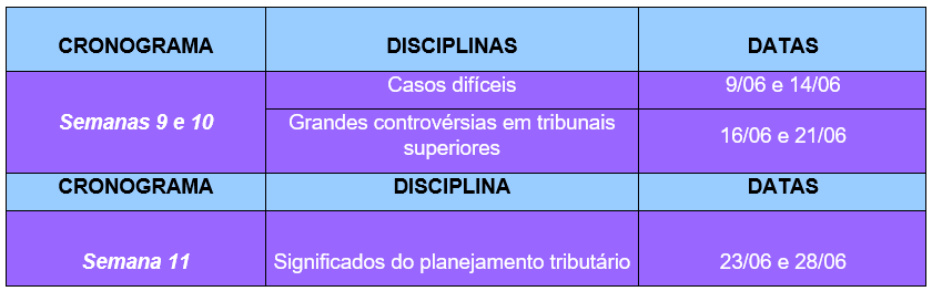 As aulas têm início no próximo dia 12 e serão transmitidas via Zoom, às segundas e quartas-feiras, sempre às 19h. Entre os temas abordados estão a interpretação, vigência e aplicação da legislação tributária, os dilemas fiscais do Brasil, além de casos difíceis e grandes controvérsias em tribunais superiores.