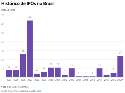 Foram 16 IPOs até o momento e há previsão de muitos outros lançamentos para os próximos meses, de modo que, mantido esse ritmo, 2021 tornar-se-á o ano com o maior número de Ofertas Públicas Iniciais de Ações no Brasil desde 2007.