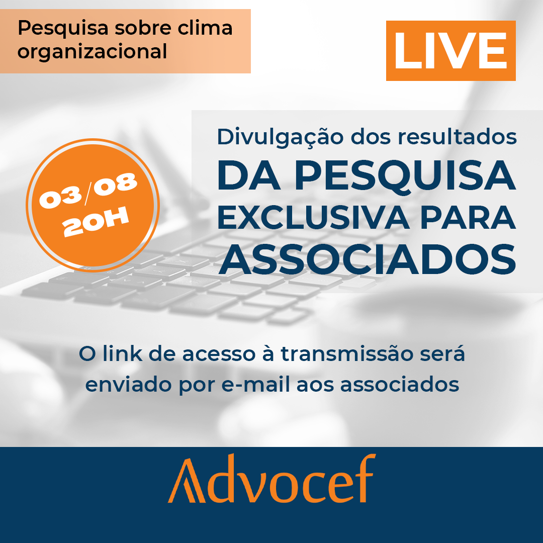 A Advocef promoverá uma live exclusiva para associados, na próxima quinta-feira (3/8), às 20h, para apresentar os resultados da pesquisa sobre clima organizacional na CAIXA. O link de acesso à transmissão será enviado ao endereço de e-mail principal cadastrado no sistema da entidade.