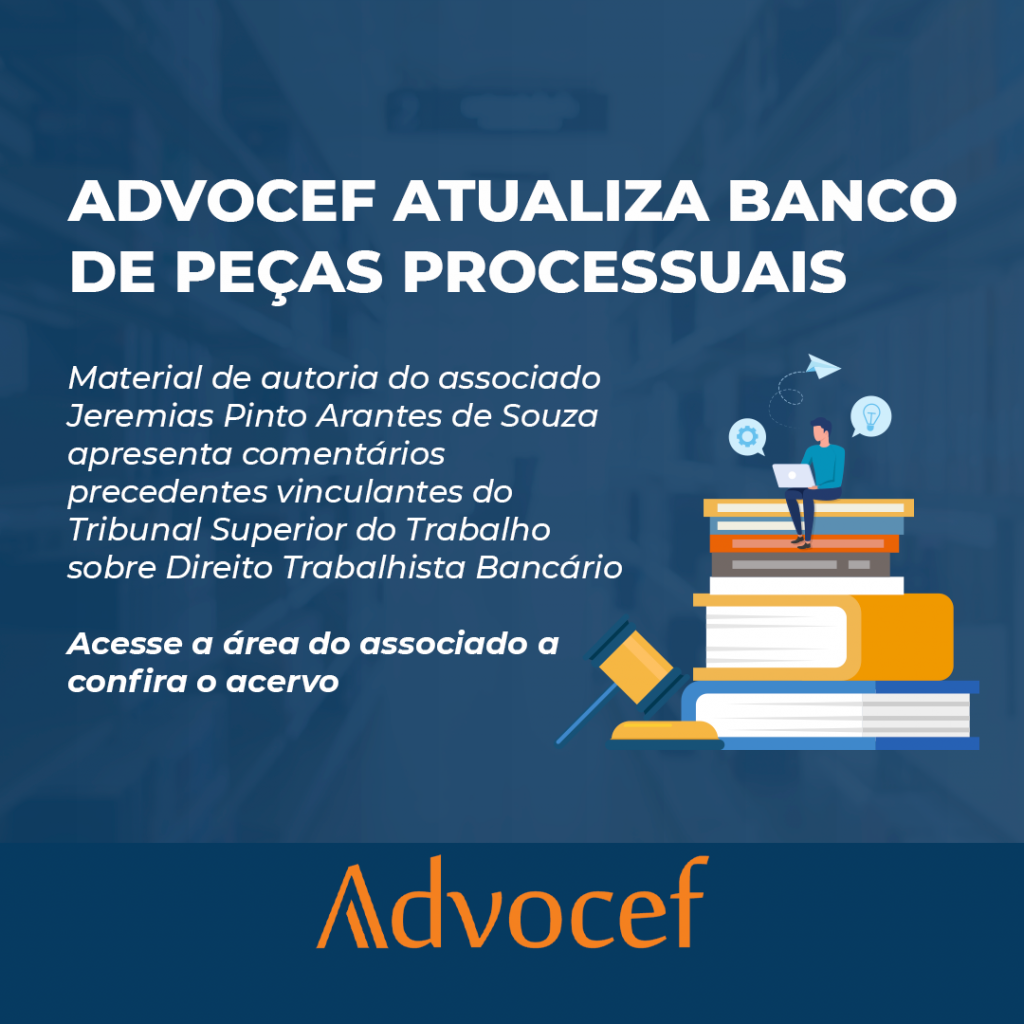 A Advocef promoveu mais uma atualização do Banco de Peças Processuais com a inclusão do artigo “Direito Trabalhista Bancário – comentários precedentes vinculantes do TST”, cujo autor é o associado Jeremias Pinto Arantes de Souza.
