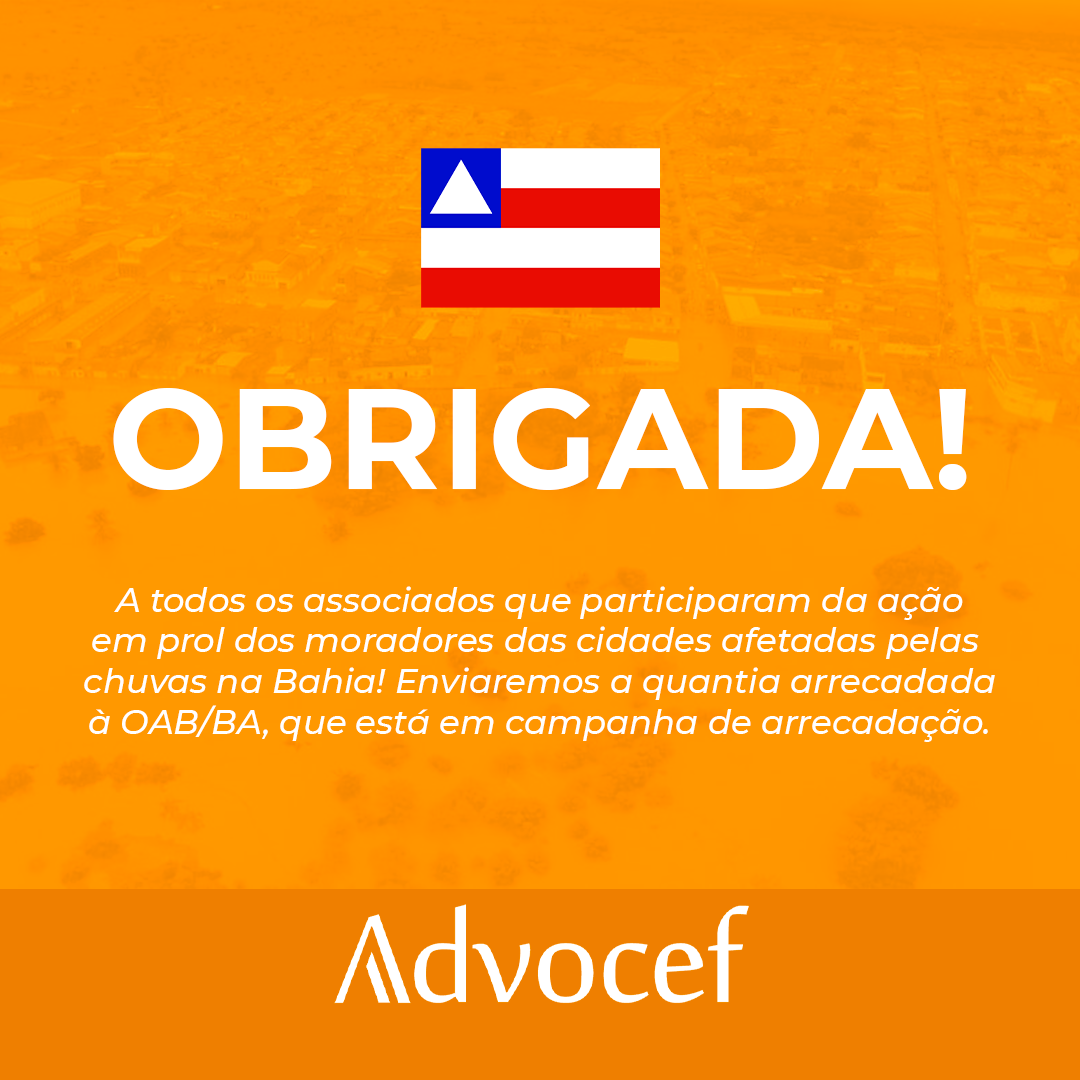 A ação encampada pela Associação Nacional dos Advogados da Caixa Econômica Federal (Advocef) para fornecer suporte aos moradores das cidades afetadas pelas chuvas na Bahia foi concluída. Ao todo, 270 associados participaram da campanha de ajuda e a arrecadação total foi de R$ 22.100,00.