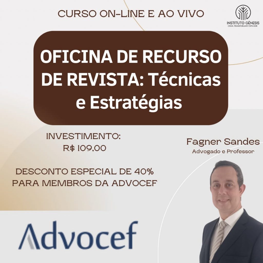 A Advocef fechou uma parceria com o Instituto Gênesis e oferece 40% de desconto aos associados na “Oficina de recurso de revista: técnicas e estratégias”, ministrada pelo advogado trabalhista Fagner Sandes.