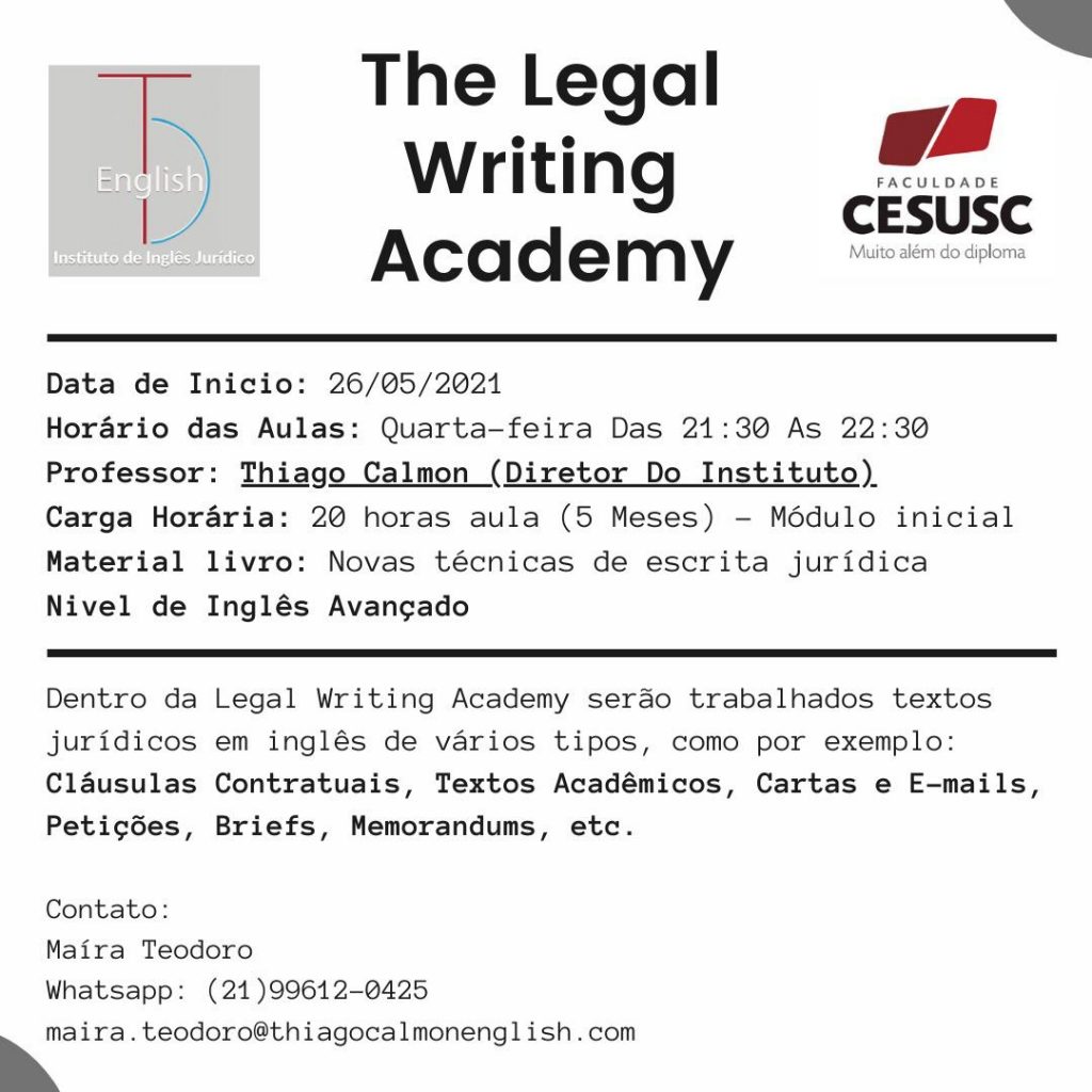 A parceria entre a Associação Nacional dos Advogados da Caixa Econômica Federal (Advocef) e o Instituto de Inglês Jurídico Thiago Calmon oferece desconto aos associados que pretendem desenvolver a escrita jurídica em inglês. O curso online “The Legal Writing Academy” tem início previsto para 26 de maio, com aulas as quartas-feiras, das 21h30 às 22h30.