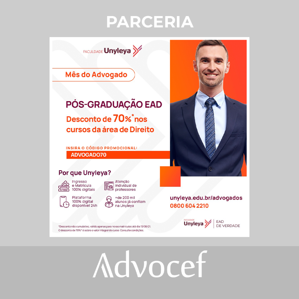 A parceria entre a Associação Nacional dos Advogados da Caixa Econômica Federal (Advocef) e a Faculdade Unyleya oferece, em agosto, descontos exclusivos em cursos de pós-graduação em Direito.
