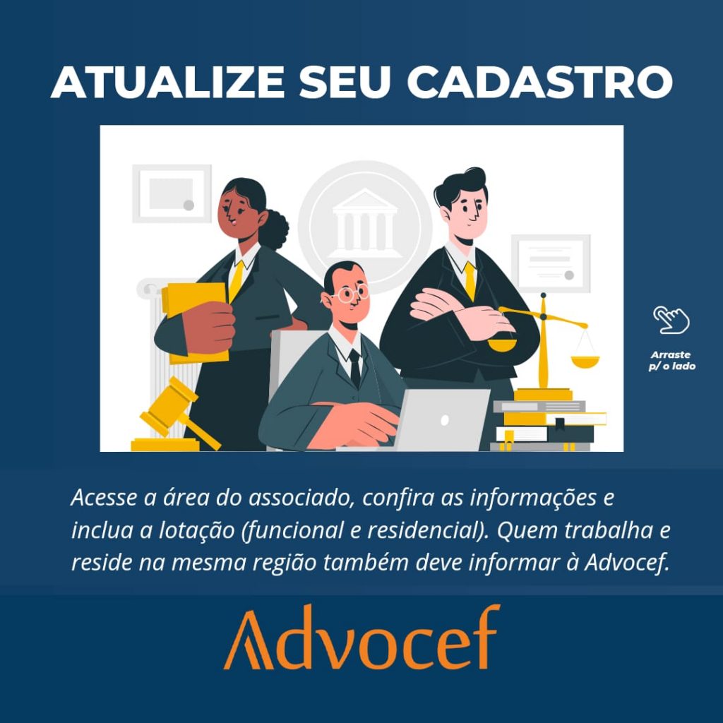 A Advocef informa a todos os associados que a atualização das informações pessoais no banco de dados da entidade deve ser feita exclusivamente pelo endereço areadoassociado.advocef.org.br, pois o APP da ainda não possibilita a inclusão total dos dados necessários.