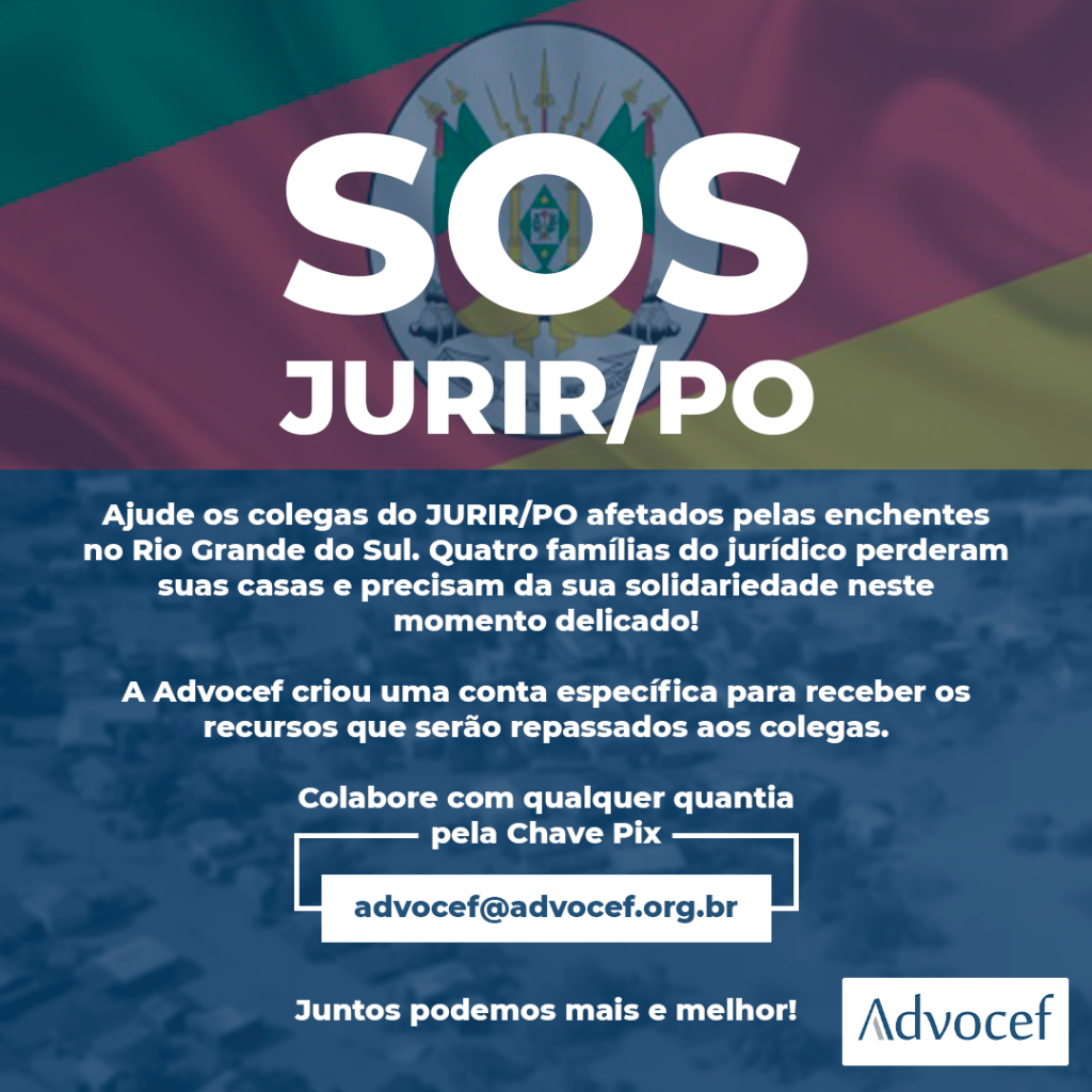 Em atenção ao pedido de associados, a Advocef retomou a campanha SOS Rio Grande do Sul, que objetiva a arrecadação de fundos por meio de autorização voluntária para desconto no rateio de honorários. Os advogados que quiserem participar deverão sinalizar a quantia a ser descontada nos valores sugeridos de R$ 70, R$ 100 ou R$ 150 para a doação de itens à população afetada.