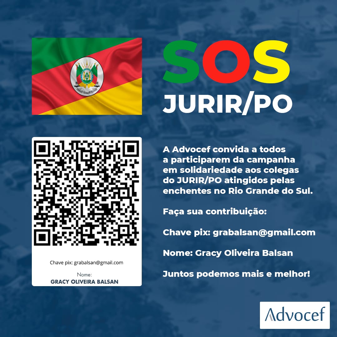 Conforme deliberação do 28⁰ Congresso, em São Paulo, a Advocef apoia e divulga a campanha encabeçada pela Unidade Jurídica de Porto Alegre, que visa a arrecadação de fundos para os quatro colegas do JURIR/PO atingidos pelas enchentes no Rio Grande do Sul.