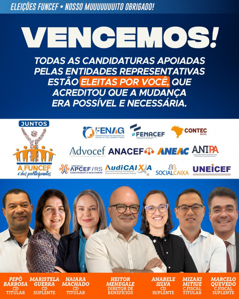 Os candidatos da Chapa Juntos: A Funcef é dos participantes alcançou votação expressiva, garantindo a eleição de Heitor Menegale para a Diretoria de Benefícios, com 24.565 votos. Para o Conselho Deliberativo foram eleitas as duplas Pepó e Maristela, com 31.945 votos, e Naiara e Anabele, com 29.822 votos. Já no Conselho Fiscal, Mizaki e Quevedo foram eleitos com ampla maioria dos votos válidos, superando 60% da preferência dos participantes, ou seja, com 27.963 votos válidos.