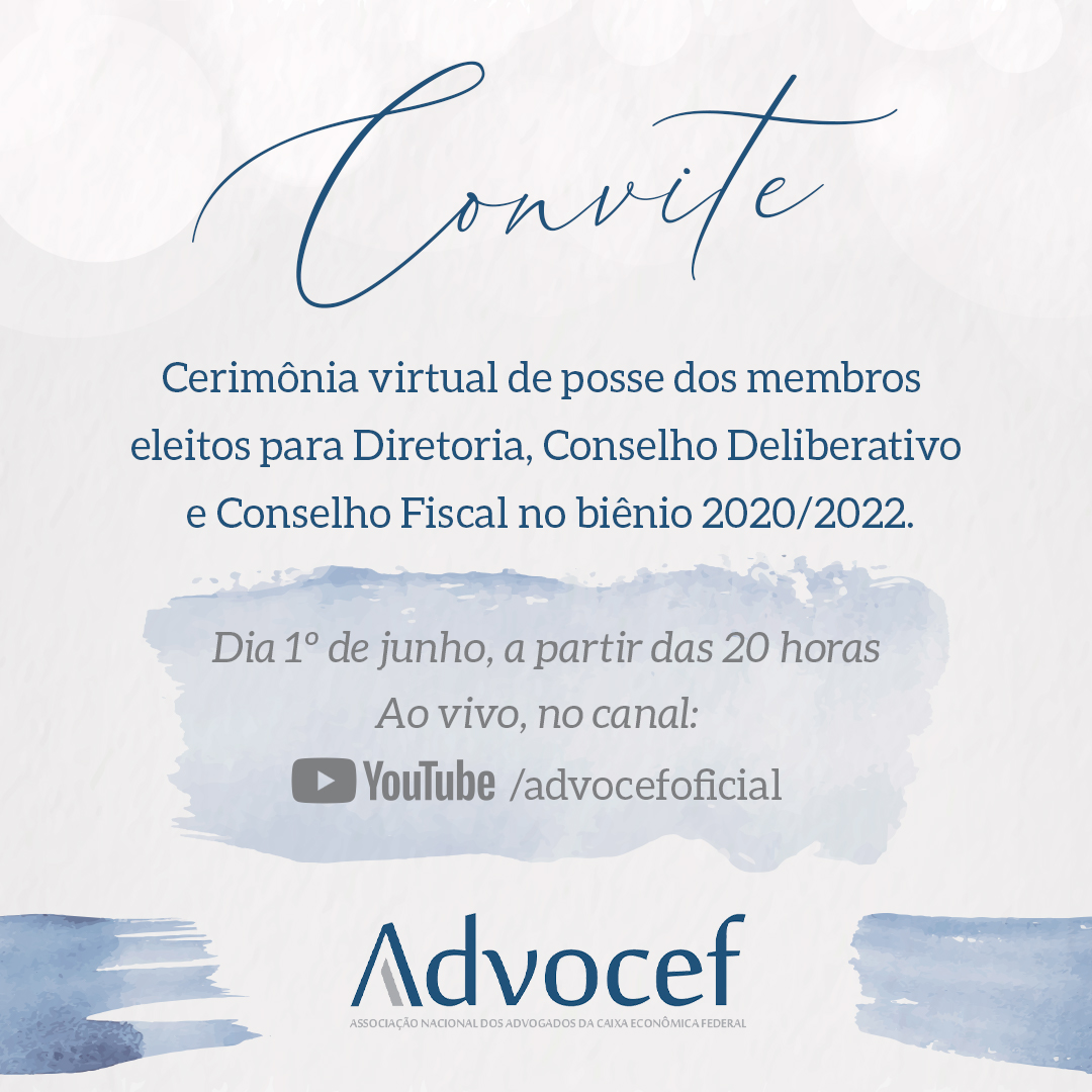 A Associação Nacional dos Advogados da Caixa Econômica Federal (Advocef) promoverá um evento virtual para registrar a posse dos membros eleitos no biênio 2020/2022. A cerimônia online ocorrerá em 1º de junho, a partir das 20h, e será transmitida, ao vivo, no canal da Associação, no YouTube.