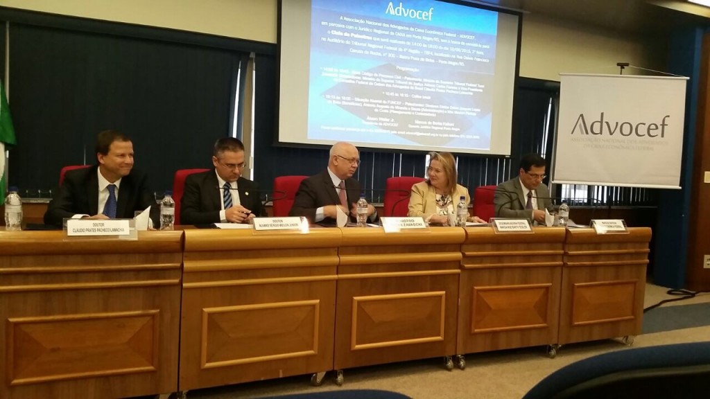 No primeiro painel, sobre o Novo Código de Processo Civil, a mesa foi formada pelo Ministro do Supremo Tribunal Federal, Teori Zavaski; presidente da ADVOCEF, Álvaro Weiler Jr., presidente do TRF4, Desembargadora Marga Inge; Vice Presidente do CFOAB, Dr. Claudio Lamachia, e o Gerente do Jurídico da CAIXA em Porto Alegre, Dr. Marcos Kafruni.