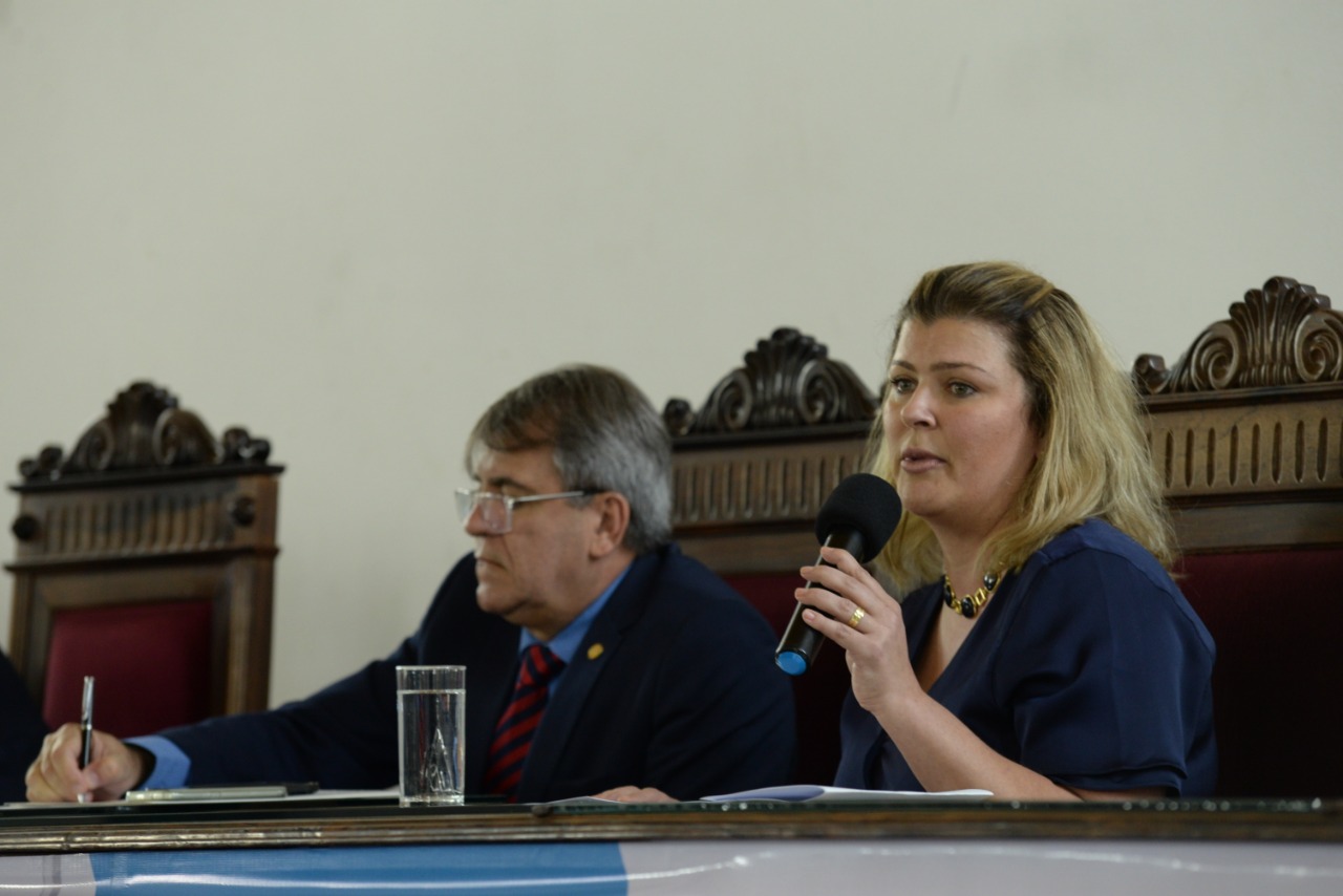 A palestrante fez ponderações sobre o trabalho das entidades representativas de funcionários das empresas estatais e dificuldades na luta contra a ingerência política e pelos direitos dos empregados, em especial utilizando do exemplo da CAIXA.