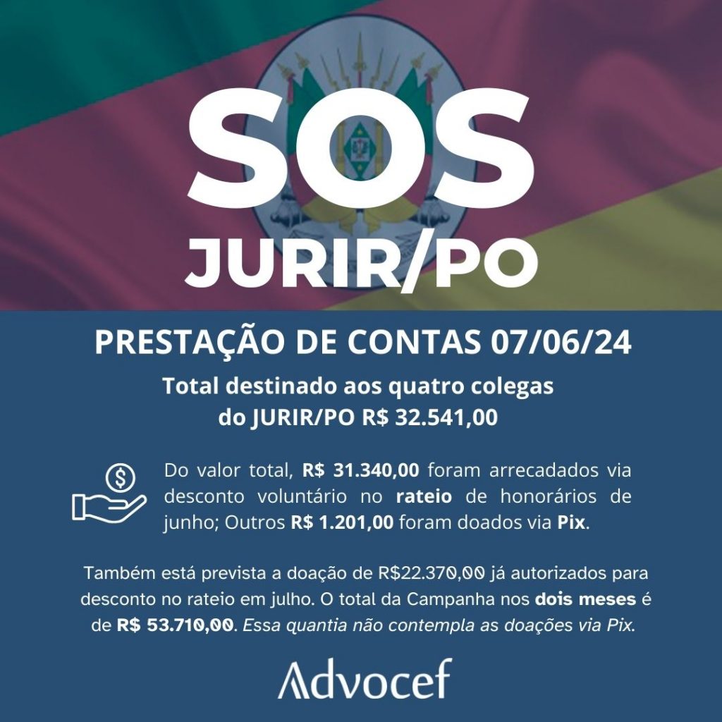 A Advocef destinou, nesta sexta-feira (7/6), o valor total de R$ 32.541,00 aos colegas do Jurídico de Porto Alegre (JURIR/PO) afetados pelas enchentes no Rio Grande do Sul. A quantia é derivada da Campanha SOS JURIR/PO, que recebeu R$ 31.340,00 em doações via desconto no rateio de honorários de junho; e outros R$ 1.201,00 via Chave Pix.