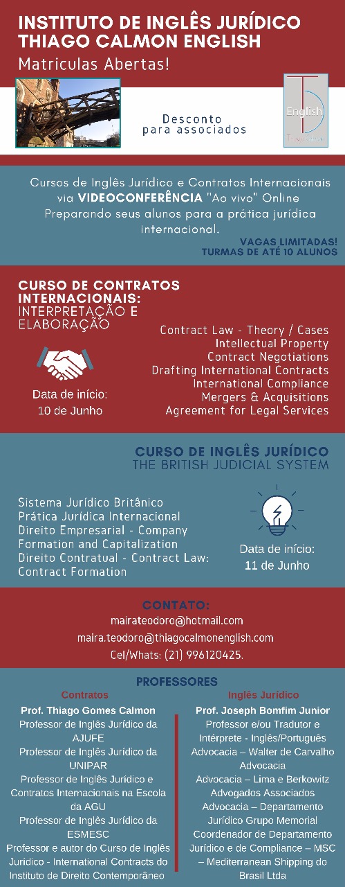 O Instituto de Inglês Jurídico Thiago Calmon English está com matrículas abertas para os cursos de Contratos Internacionais e Inglês Jurídico. As oportunidades são ofertadas por meio convênio firmado pela Associação Nacional dos Advogados da Caixa Econômica Federal (Advocef) e têm descontos de 20% para os filiados.