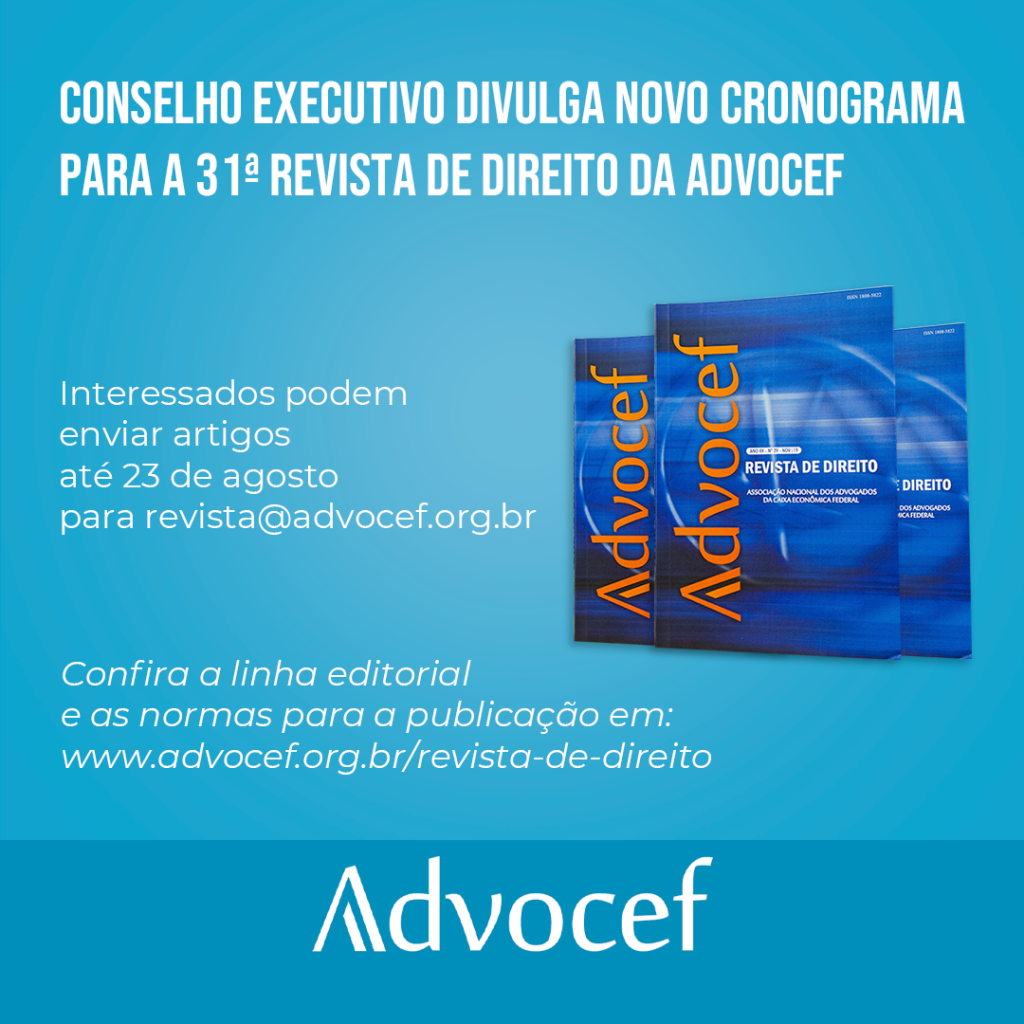 O Conselho Executivo da Revista de Direito da Associação Nacional dos Advogados da Caixa Econômica Federal (Advocef) divulgou um novo cronograma para a próxima edição do material. Agora, o prazo de envio dos artigos será até 23 de agosto e a apresentação está prevista para ocorrer em novembro.