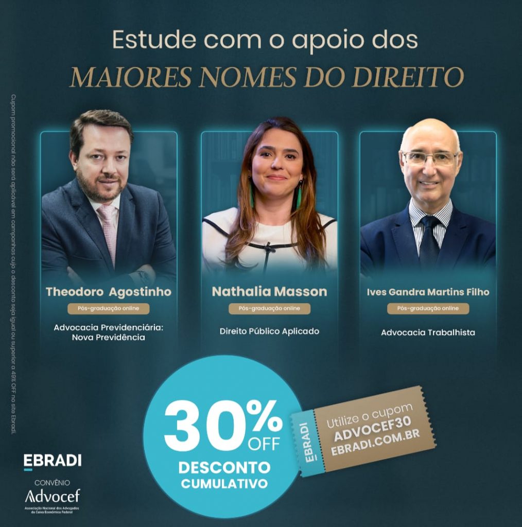 Parceira da Advocef, a EBRADI oferece 30% OFF cumulativo aos associados nos cursos de pós-graduação em diversas áreas, como Advocacia Trabalhista, Direito Público Aplicado (com duração de 6 meses), Advocacia Contratual e Responsabilidade Civil, entre outras. Para saber mais, acesse o site www.ebradi.com.br.