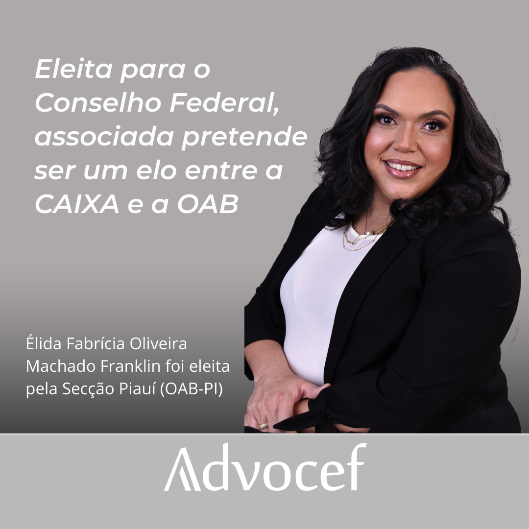 “É muito bom ver mulheres cada vez com mais vontade de pleitear a ocupação de espaços importantes em nossa sociedade. Em nome da Advocef quero parabenizar nossa associada Élida pela eleição ao Conselho Federal do Piauí. Sem dúvidas, a CAIXA tem muito a ganhar com a participação de seus advogados em frentes de trabalhos tão importantes como esta”, diz.