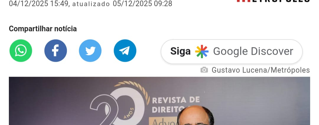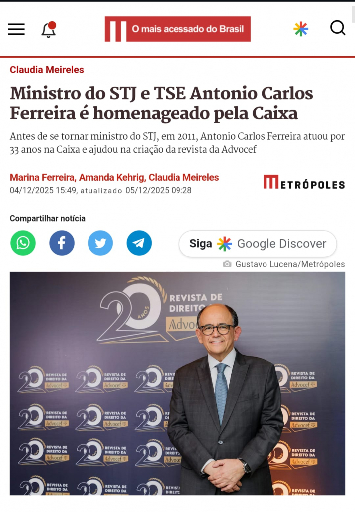 O jornal Metrópoles repercutiu a homenagem da Advocef ao Ministro Antonio Carlos Ferreira, durante a celebração dos 20 anos da Revista de Direito, em comemoração realizada na Caixa Cultural, em Brasília, na última quarta-feira (03/12).