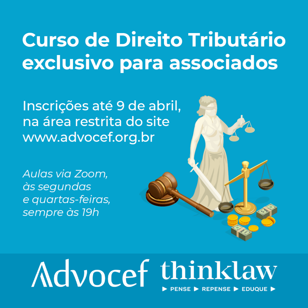 A Associação Nacional dos Advogados da Caixa Econômica Federal (Advocef) oferece aos associados o curso online de Direito Tributário em parceria com a empresa ThinkLaw. As inscrições poderão ser realizadas até sexta-feira (9), na área restrita do site.