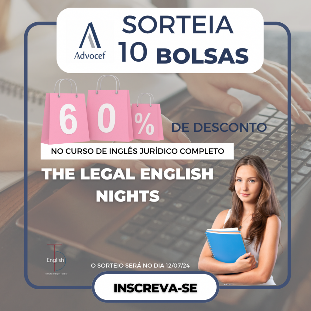 O Instituto de Inglês Jurídico – Thiago Calmon, em parceria com a Advocef está sorteando DEZ bolsas de 60% de desconto para o curso de inglês jurídico completo (The Legal English Nights). Fique atento! O sorteio será realizado no dia 12 de julho, e o resultado será divulgado no instagram do Instituto.