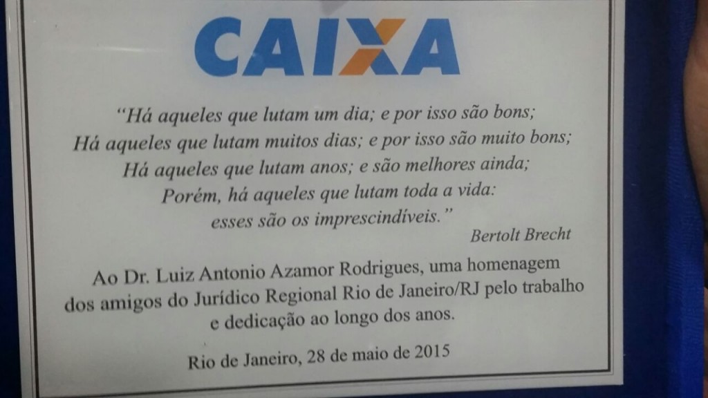 Vendo a homenagem dos colegas do Rio para você, me lembrei de momentos especiais que vivi no JURIR/RJ quando jovens nos tornamos advogados da CAIXA. Sempre admirei sua alegria, sua independência e a lisura de seu comportamento independentemente da função que estivesse exercendo.Tenho certeza que continuará sendo muito feliz. Que Deus continue iluminando seu caminho.