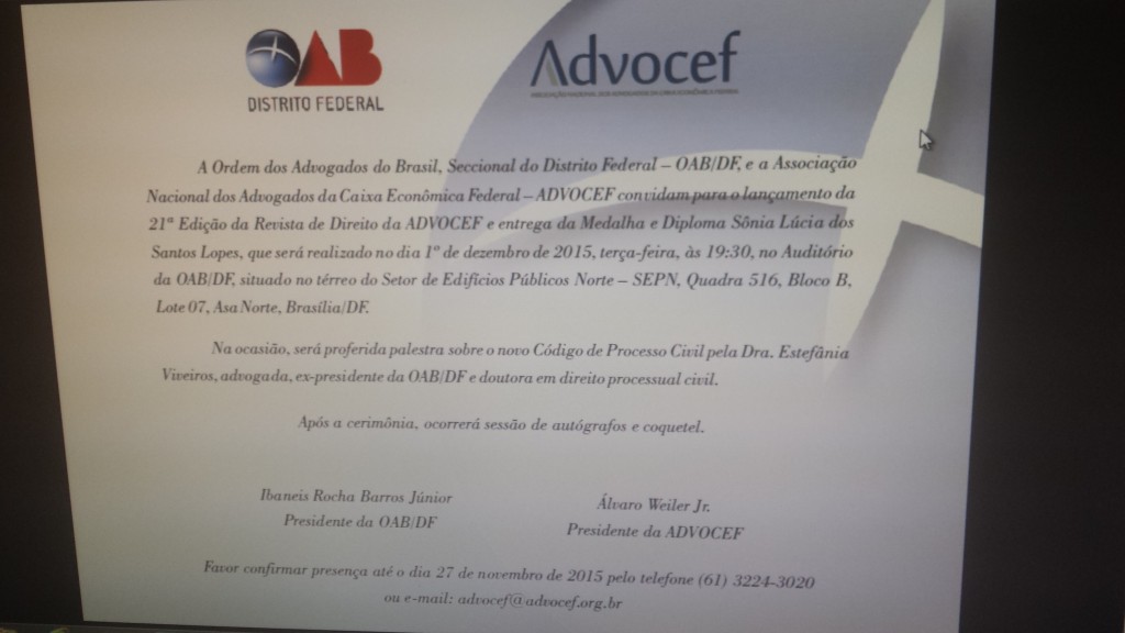 A cerimônia de lançamento da 21ª Edição ocorrerá no dia 1º de dezembro de 2015, terça-feira, às 19:30, no Auditório da Ordem dos Advogados do Brasil, Seccional do Distrito Federal – OAB/DF.
