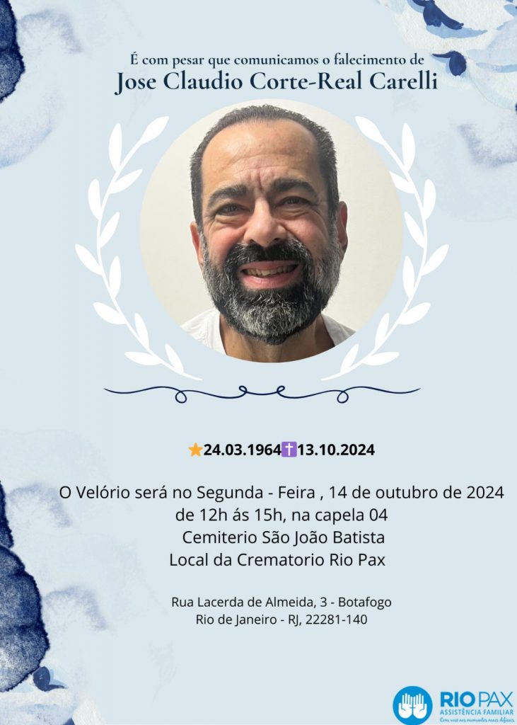 Os atos de despedida ocorrerão nesta segunda-feira (14/10), no Cemitério São João Batista, localizado na Rua Lacerda de Almeida, nº 3, Botafogo-RJ, com velório das 12h às 15h, na capela 4.