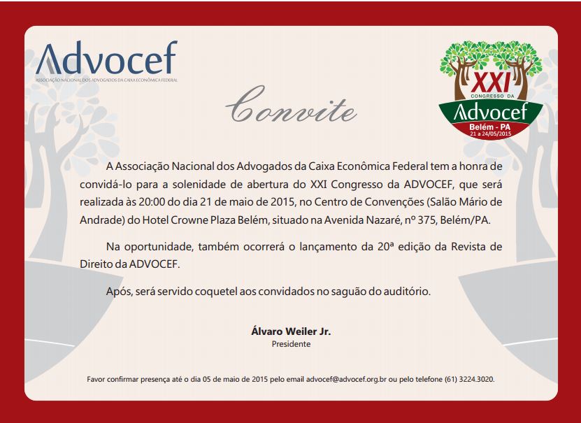 O XXI Congresso da ADVOCEF será realizado no período de 21 a 24 de maio de 2015, em Belém/PA. O evento é organizado pela Diretoria com o auxílio de Comissão Organizadora local formada por advogados do Jurídico Belém/PA.