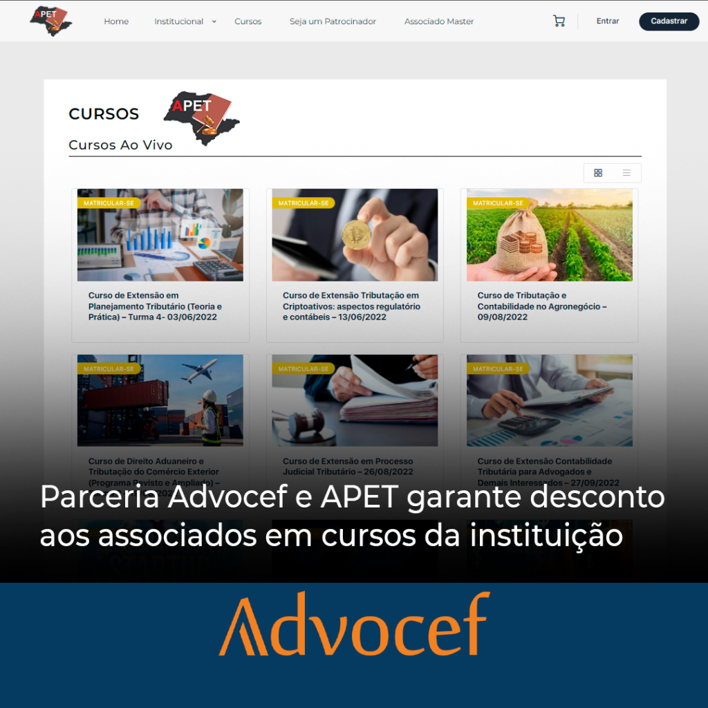 Em atenção ao pedido dos associados, a Advocef firmou uma parceria com a Associação Paulista de Estudos Tributários (APET) que garante 5% de desconto na inscrição dos cursos oferecidos pela instituição.