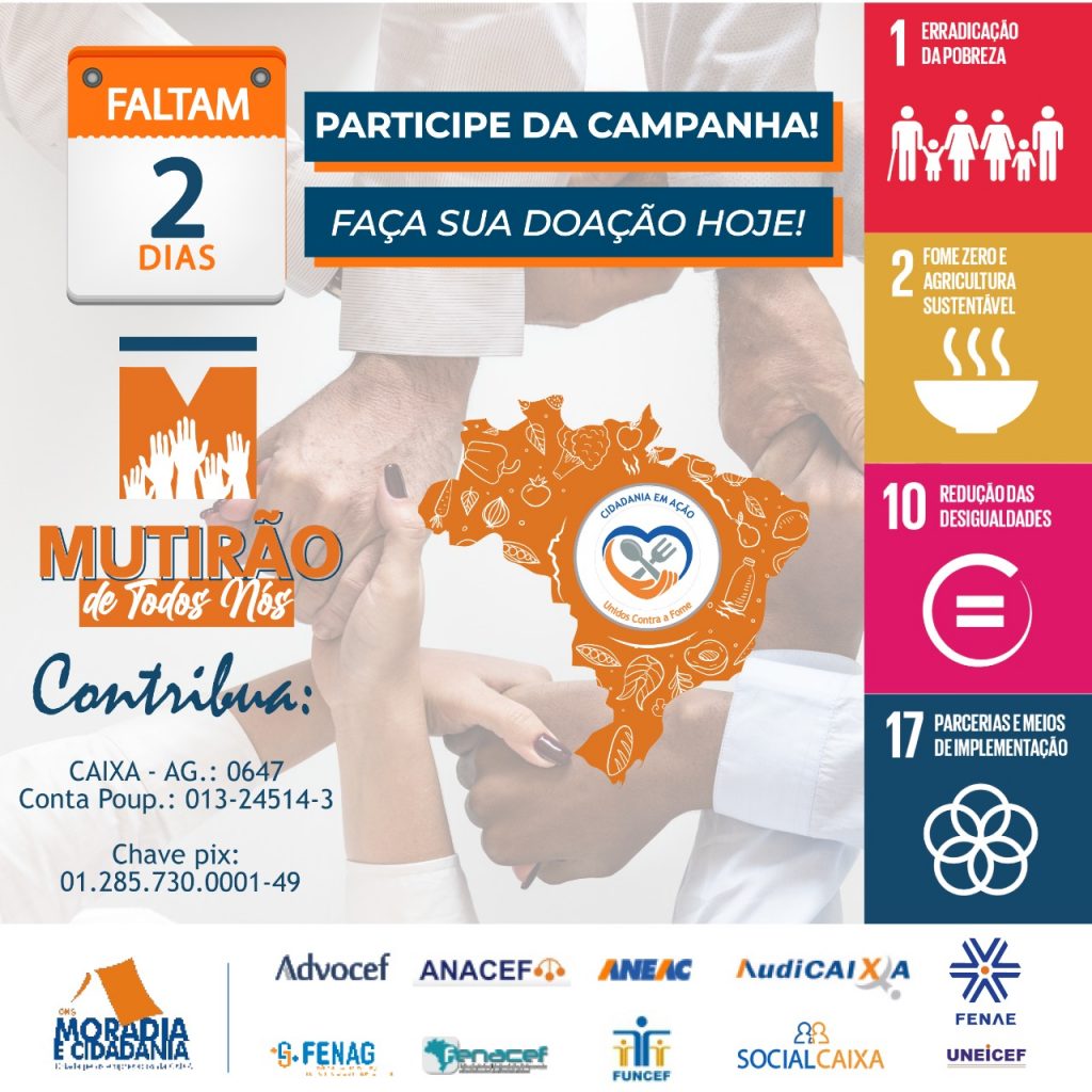 A ação é promovida pela ONG Moradia e Cidadania, criada pelos empregados da CAIXA, e ocorre em parceria com todas as entidades representativas dos trabalhadores do banco. De acordo com a ONG, até 29 de junho foram doadas 13.025 cestas básicas em todo Brasil por meio de colaborações voluntárias, que fazem total diferença na vida de quem mais precisa.