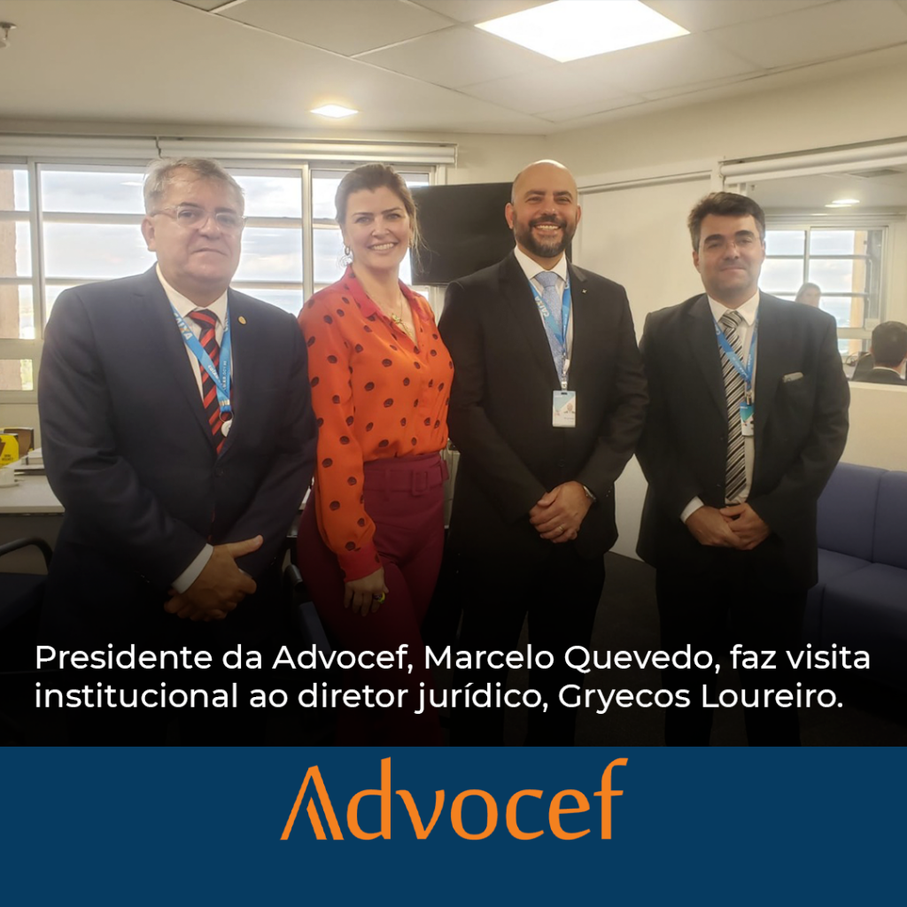 O presidente da Advocef, Marcelo Quevedo do Amaral, fez uma visita institucional, na quinta-feira (6/5), ao diretor jurídico da CAIXA, Gryecos Loureiro. O diretor de relacionamento institucional, Carlos Castro, e a tesoureira da associação, Anna Claudia de Vasconcellos, também participaram do encontro.