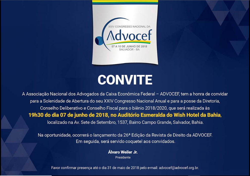 De 28 de maio a 04 de junho está aberto espaço na área restrita site para aqueles que tiverem interesse em outorgar poderes, através de procuração eletrônica, para representação nas discussões do XXIV Congresso da ADVOCEF, em Salvador, dia 09 de junho.