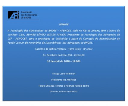 Na última terça-feira, 10/04, o presidente Álvaro Weiler representou a ADVOCEF na solenidade de instituição da Comissão de Administração do Fundo Comum de Honorários de Sucumbência dos Advogados do BNDES.