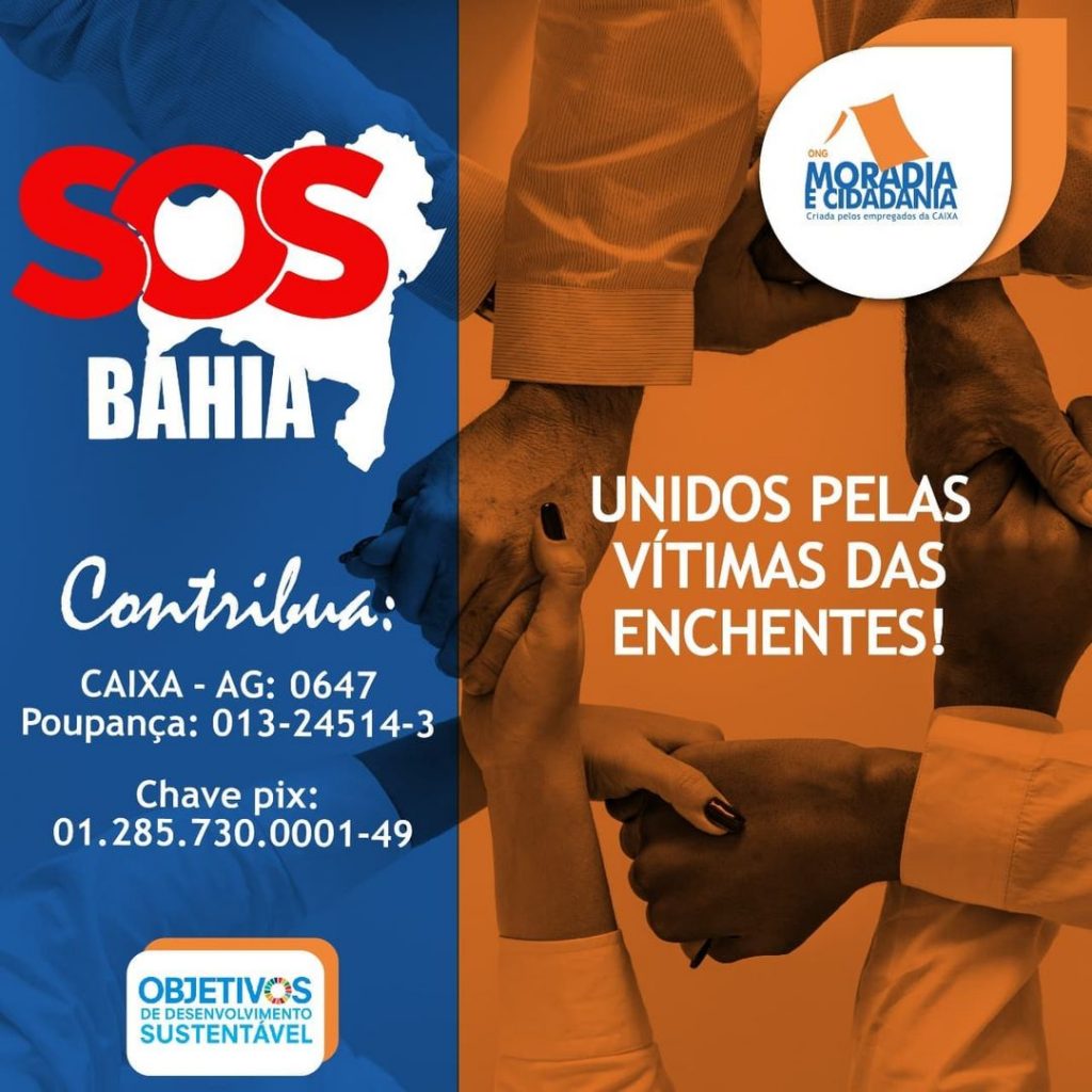 A Associação Nacional dos Advogados da Caixa Econômica Federal (Advocef) comunica aos associados que o valor arrecadado na campanha em prol dos moradores das cidades afetadas pelas chuvas na Bahia foi redirecionado para a ONG Moradia e Cidadania.