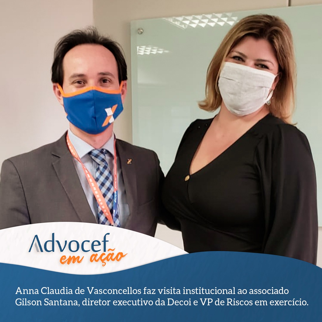 A presidente da Associação Nacional dos Advogados da Caixa Econômica Federal (Advocef), Anna Claudia de Vasconcellos, realizou uma visita institucional, na terça-feira (2), ao associado Gilson Santana, que assumiu a Diretoria Executiva de Controle Interno (Decoi) e é o vice-presidente Riscos, em exercício.