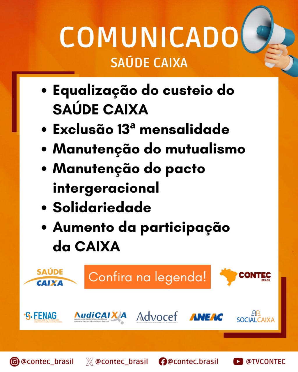 A Advocef enviou à CONTEC uma proposta sobre as condições do Saúde Caixa na terça-feira (17). O material foi elaborado em conjunto com a ANEAC, AUDICAIXA, FENAG, e Social CAIXA e mostra a preocupação das entidades com as discussões do custeio para o plano de saúde.