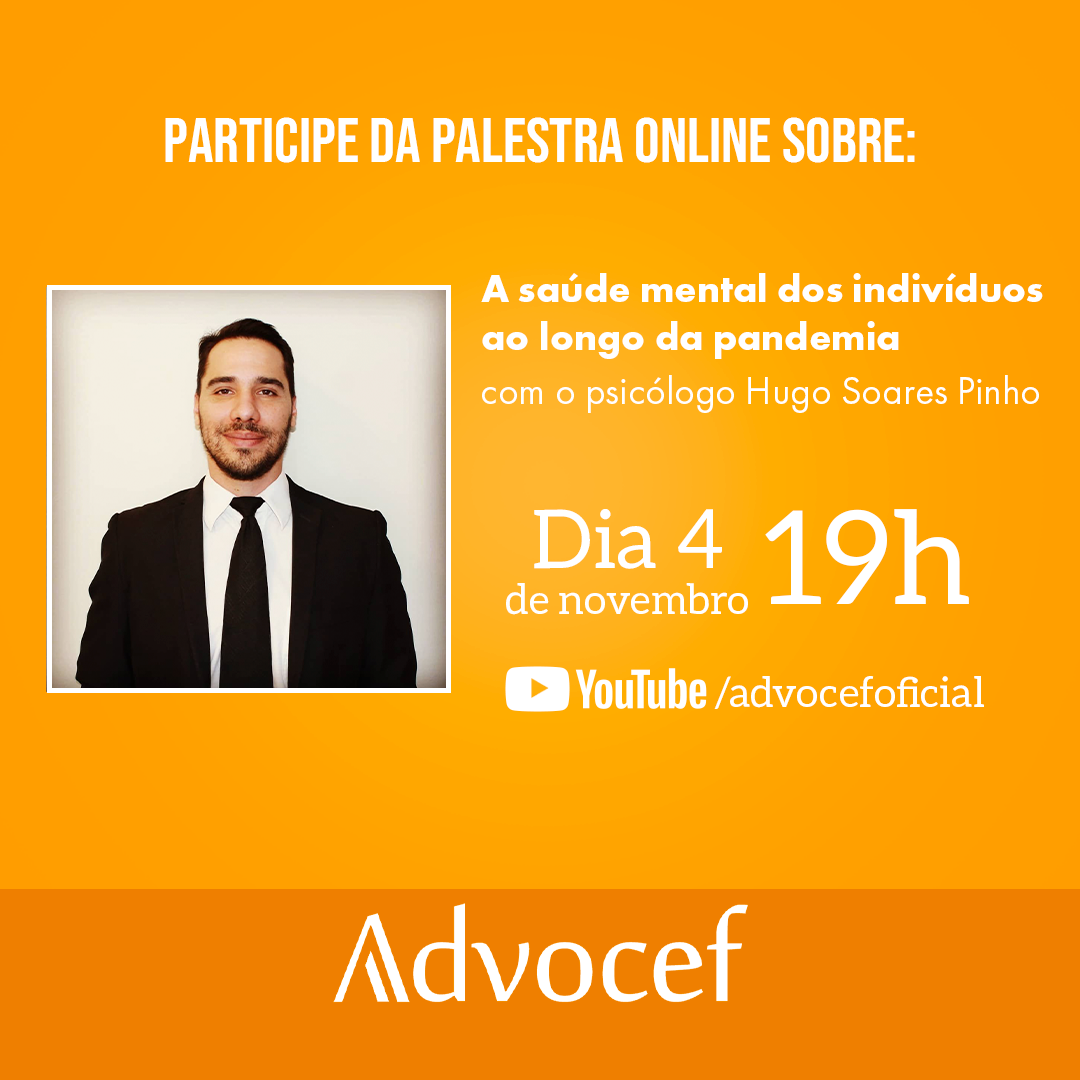 Para falar sobe a saúde mental dos indivíduos ao longo da pandemia, a Associação Nacional dos Advogados da Caixa Econômica Federal (Advocef) promove uma palestra online com o psicólogo Hugo Soares Pinho. O evento exclusivo para associados será transmitido no YouTube da Advocef, às 19h, no dia 4 de novembro.