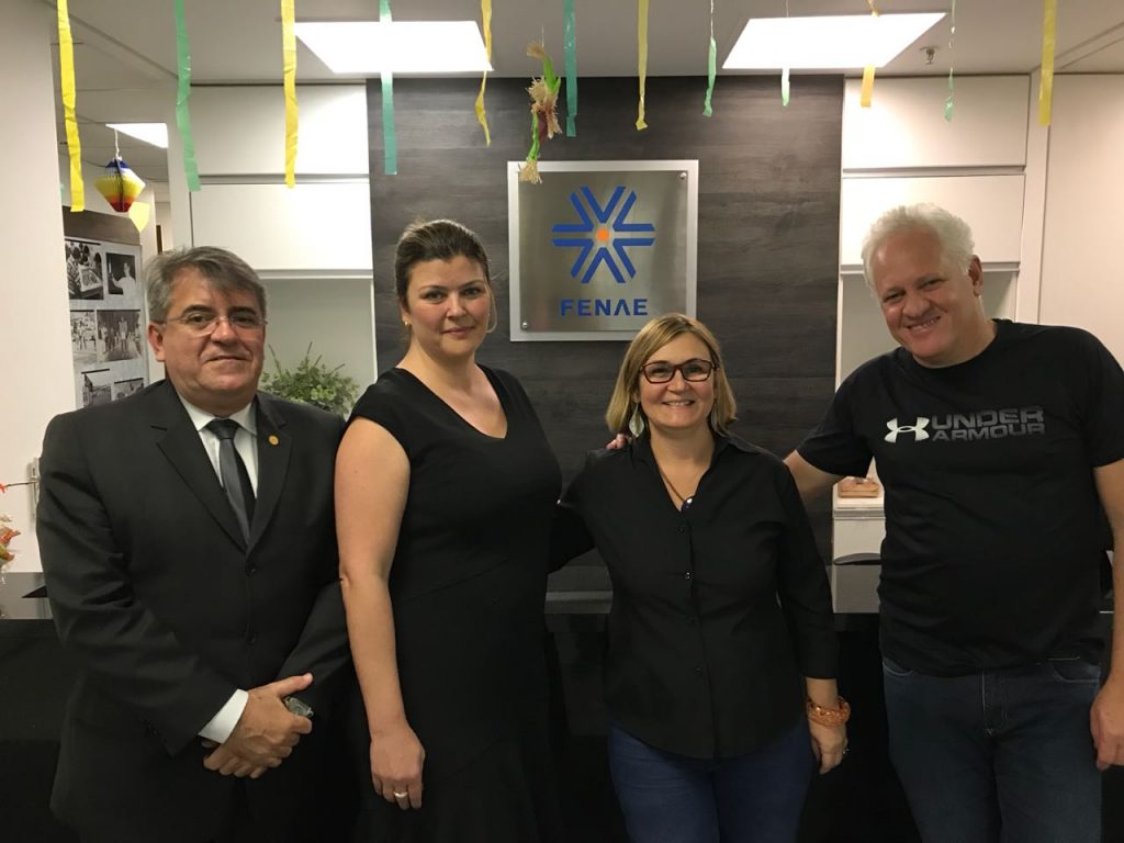 Na tarde dessa quarta feira, estiveram reunidos na sede da FENAE, a Presidente da Advocef Anna Claudia de Vasconcellos, acompanhada do Diretor de Relacionamento Institucional Carlos Castro, a representante dos empregados no Conselho de Administração da Caixa Rita Serrano e com o Diretor de Administração e Finanças da Fenae Clotário Cardoso.