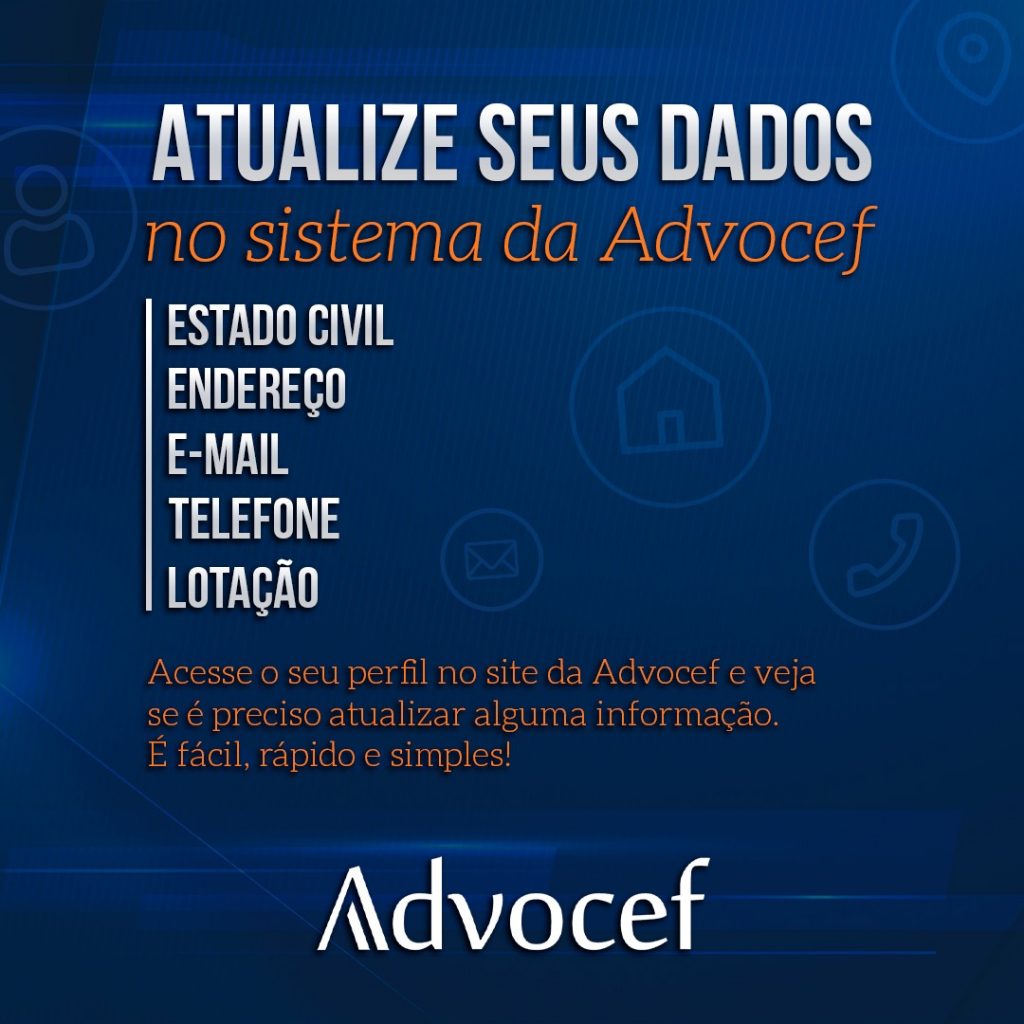 A Advocef solicita aos associados que atualizem as informações pessoais constantes no sistema até a próxima sexta-feira (21/6). Para isso, basta acessar a área restrita do site mediante login e senha, clicar em “MEU PERFIL”, e em seguida “DADOS PESSOAIS”. Feito isso, será possível verificar os dados e promover as eventuais alterações.