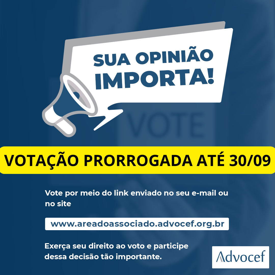 Em razão da baixa participação dos associados, o presidente da Advocef, Marcelo Quevedo do Amaral, e o presidente do Conselho Deliberativo, Davi Duarte, decidiram, em comum acordo, prorrogar a votação das alterações no Estatuto Social. A consulta aos associados fica disponível no sistema até às 18h, da segunda-feira (30/09).